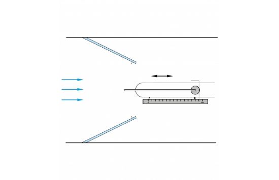 The GUNT HM 170.25 Model "Bernoulli" is designed for use in the HM 170 wind tunnel to study the variation of pressure in a gradually contracting section. The experimental unit consists of two tapered inserts that create a controlled contraction of the measuring section. Dynamic and static pressures are measured using a Pitotstatic tube, which is moved from the start of the contraction to the narrowest point to record pressure as a function of position. The apertures are fixed to the side walls with bolts, and the Pitotstatic tube slides along a slot in the bottom of the measuring section. The exact position of the probe is indicated on a scale beside the slot.